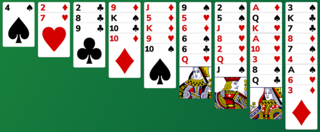 - Et av de øverste kortene i de ni kolonnene kan flyttes til en annen kolonne med motsatt farge (rød, svart) og med en høyere valør.