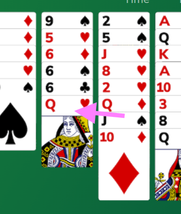 Varianten jeg spiller med gjør at du kan flytte spar-knekt og ruter-10 samlet over til den andre dronningen. De tradisjonelle reglene ville krevd at du har en tom kolonne slik at tieren kan mellomlande i den tomme kolonnen før knekten flyttes til damen, og tieren oppå knekten.